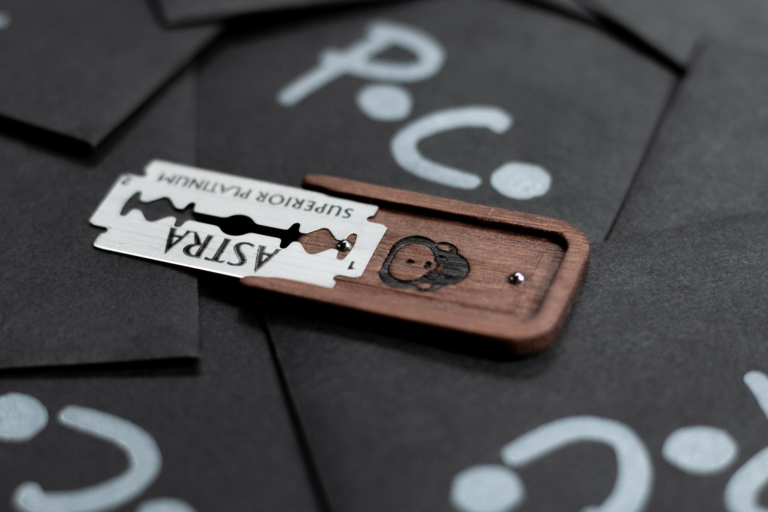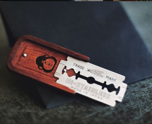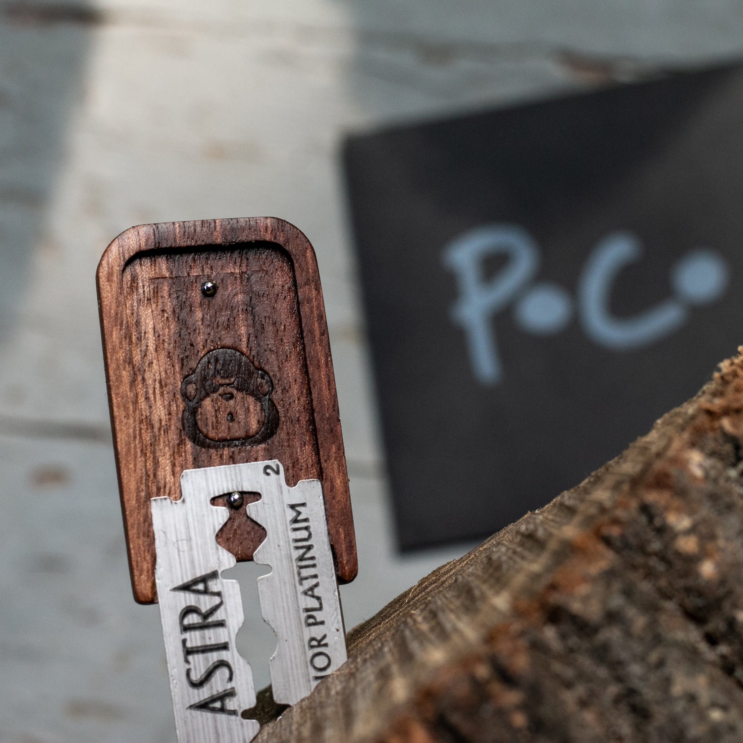 So, Wire Monkey took it as a personal challenge to go even smaller: maintaining his design philosophy of no knobs, beautiful aesthetics, no plastics, simple. You keep your thumb on the blade while scoring, intimate, but it's much safer than handling a bare blade. And when you're done, you tuck the blade inside for safe keeping.